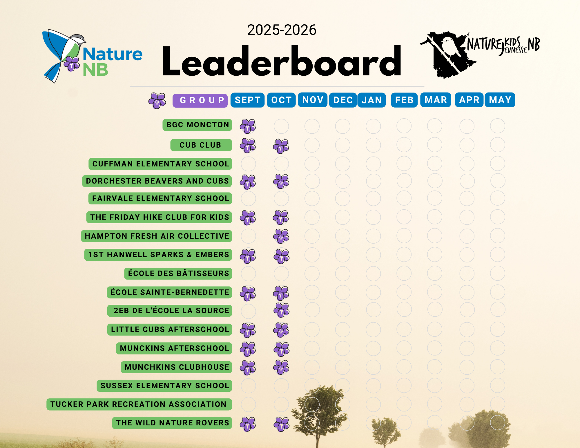 NatureKids NB programs are run by pre-existing groups across the province, which you can see on the leaderboard above! Sign up for the NatureKids newsletter to receive modified versions of the monthly activity suggestions that are sent to existing NatureKids groups.