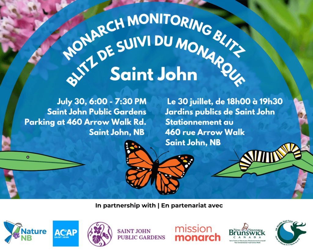 Come help survey Monarch Butterfly populations with us! Join Nature NB, ACAP Saint John and the Saint John Public Gardens for Mission Monarch’s 2025 International Monitoring Blitz. At the Saint …